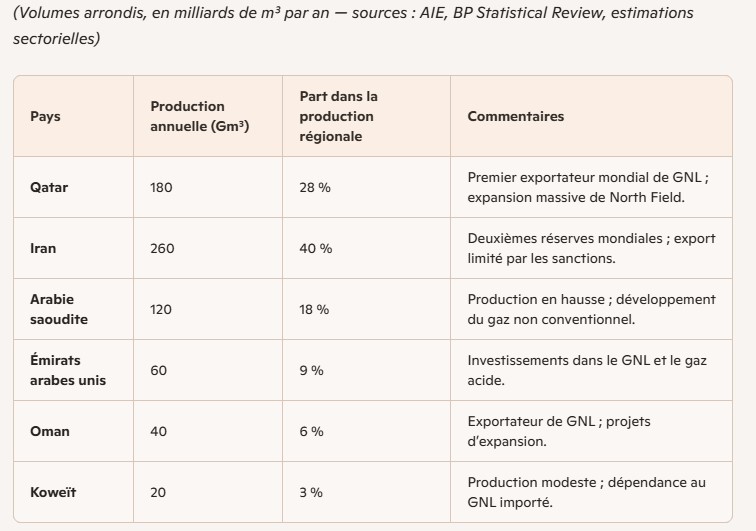 Carte ou graphique montrant la production de gaz naturel au Moyen‑Orient en 2024, incluant Qatar, Iran, Arabie saoudite, EAU, Oman et Koweït.